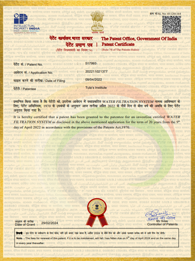 | 20 | 202211021377 | Published | Abhishek Chakravorty Vrij Mohan Vidhyarthi | 2022 | Water Filtration System |