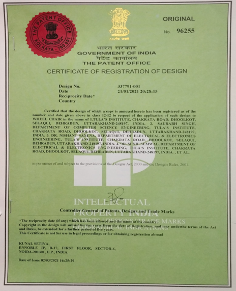 | 7 | 337791-001 | Granted | Dr. Nishant Saxena Dr. Sunil Semwal Mr. Akhil Kumar Prasad Mr. Abhishek Jaiswal Anukumar Saini | 2020 | Design and Development of Multipurpose Wheel Chair |