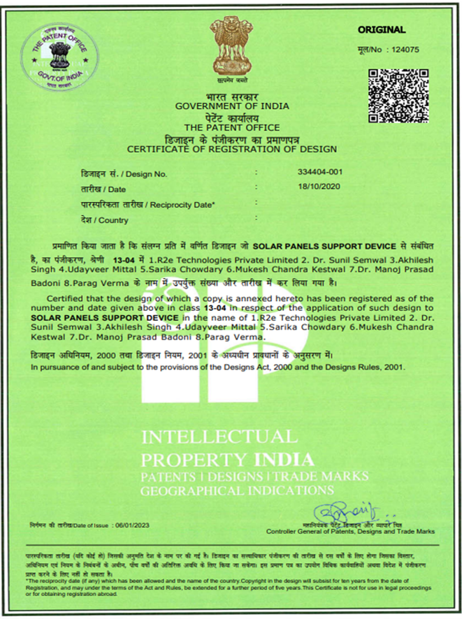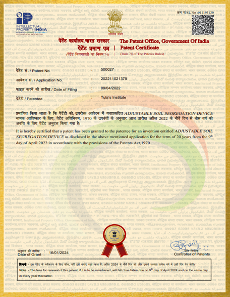 | 23 | 202211021379 | Published | Dr Sandip Vijay Dr Raghav Garg | 2022 | Adjustable Soil Segregation Device |