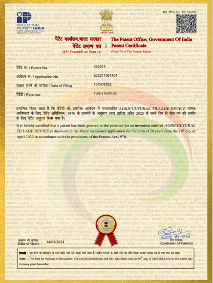 | 26 | 202211021401 | Published | Dr Sandip Vijay Dr Raghav Garg | 2022 | Agricultural Tillage Device |