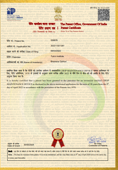 | 24 | 202211021380 | Published | Dr Prerana Badoni | 2022 | Shrub Shape Maintenance Device |