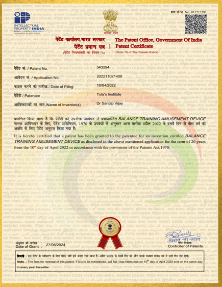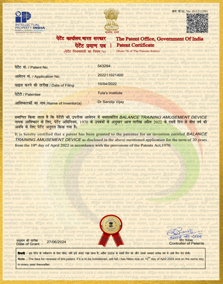 | 29 | 202211021400 | Published | Dr Sandip Vijay | 2022 | Balance Training Amusement Device |